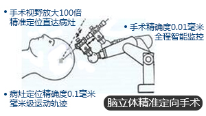 三维立体影像技术,可使手术视野放大百倍,定向仪定位精度一般在0.1毫米左右,通过对患者颅脑进行细致的扫描,选用16排的CT、3.0高密度的核磁、神经导航手术计划系统、 来构建三维立体脑部结构图,结合生物探测系统、微电极超显微系统、神经电生理信号系统,精确定位脑位异常特定靶点,来精准定位微创手术的部位,精准到0.01毫米。